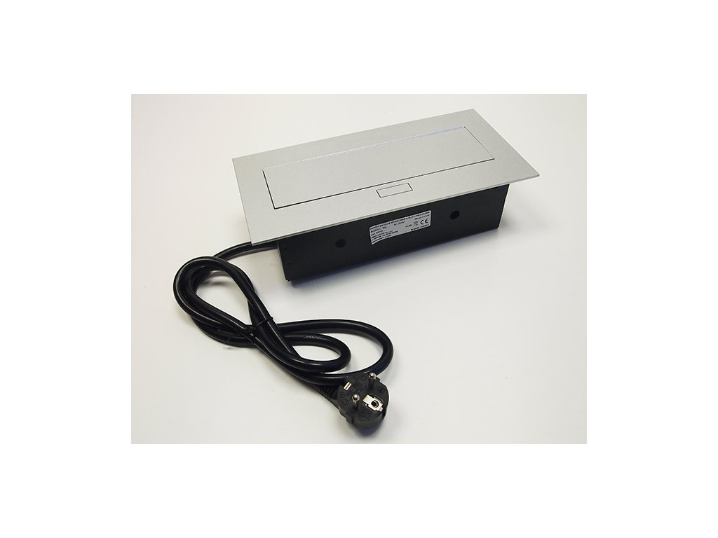 Univerzální vyklápěcí zásuvková skříň pro zapuštěnou montáž do pracovní desky stolu nebo kuchyňské linky. 3 vestavěné zásuvky 230V, max. zatížení jedné zásuvky 16A, maximální zatížení 3 zásuvek je 2500W. Tlačítko pro otevření skříňky, zavření skříňky se provádí zaklapnutím. Jemný chod otevření i zavření je zajištěno vestavěnou brzdou. Připojovací 1,5m kabel s vidlicí do síťové zásuvky 230V. Barva - stříbrná.