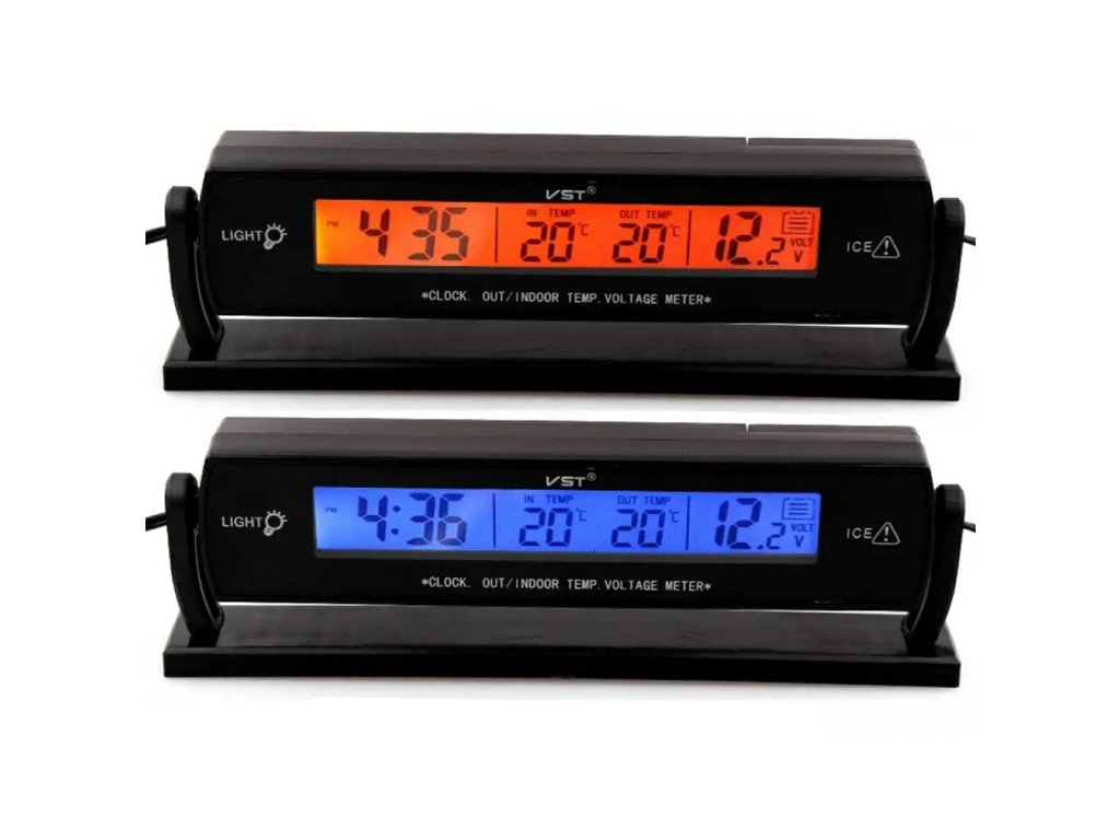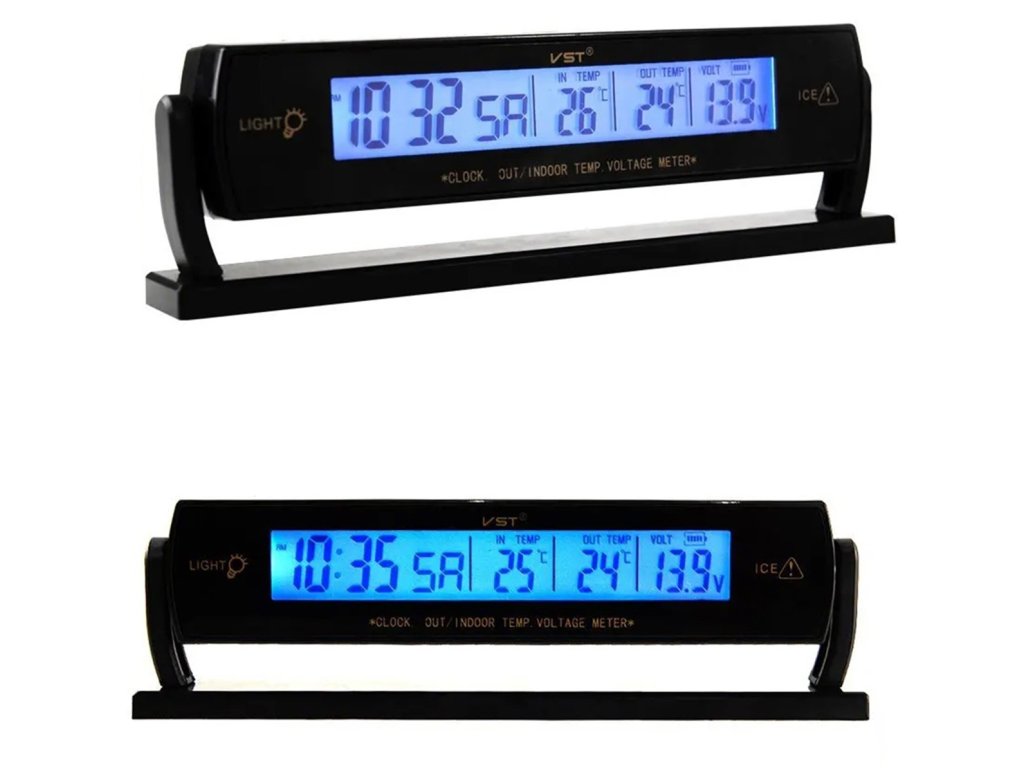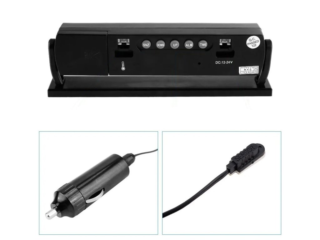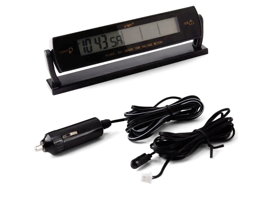 Elektronický teploměr do auta s hodinkami a měřením nabití baterie. Teploměr má velký, přehledný LCD displej s podsvícením (napájený z 12V zásuvky autozapalovače), který současně zobrazuje teplotu ze dvou senzorů, čas a napětí baterie. Dlouhý kabel s voděodolným snímačem vnější teploty umožňuje umístění snímače pod přední nárazník, což zaručuje nejlepší měření vnější teploty při jízdě a parkování. Možnost změny formátu zobrazení času (12 nebo 24) a jednotky teploty (C / F).