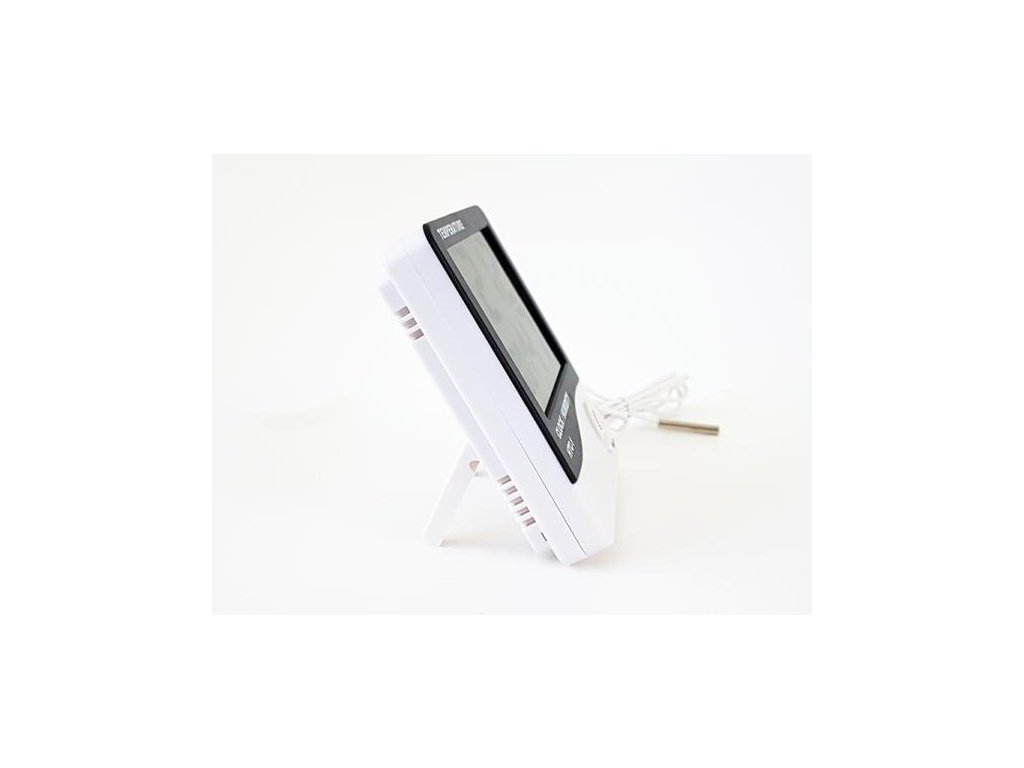 Digitální teploměr s vlhkoměrem do domácnosti, kanceláře a jiných vnitřních prostor. Měří vnitřní i venkovní teplotu, vnitřní vlhkost, záznam maximální a minimální naměřené teploty s automatickým nulováním. Zobrazení času a nastavitelný budík. Možnost postavení nebo zavěšení, externí čidlo na 2m kabelu