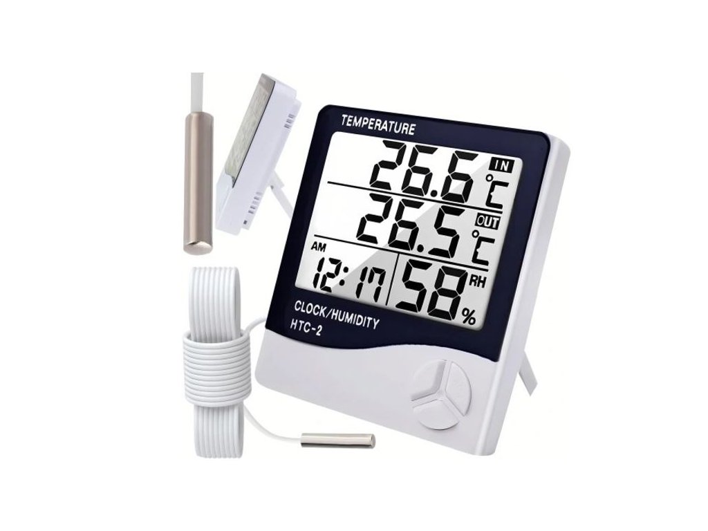 HTC 2 - nástěnný digitální teploměr s vlhkoměrem s výklopným stojánkem, velký displej, paměť minimální a maximální teploty, budík
