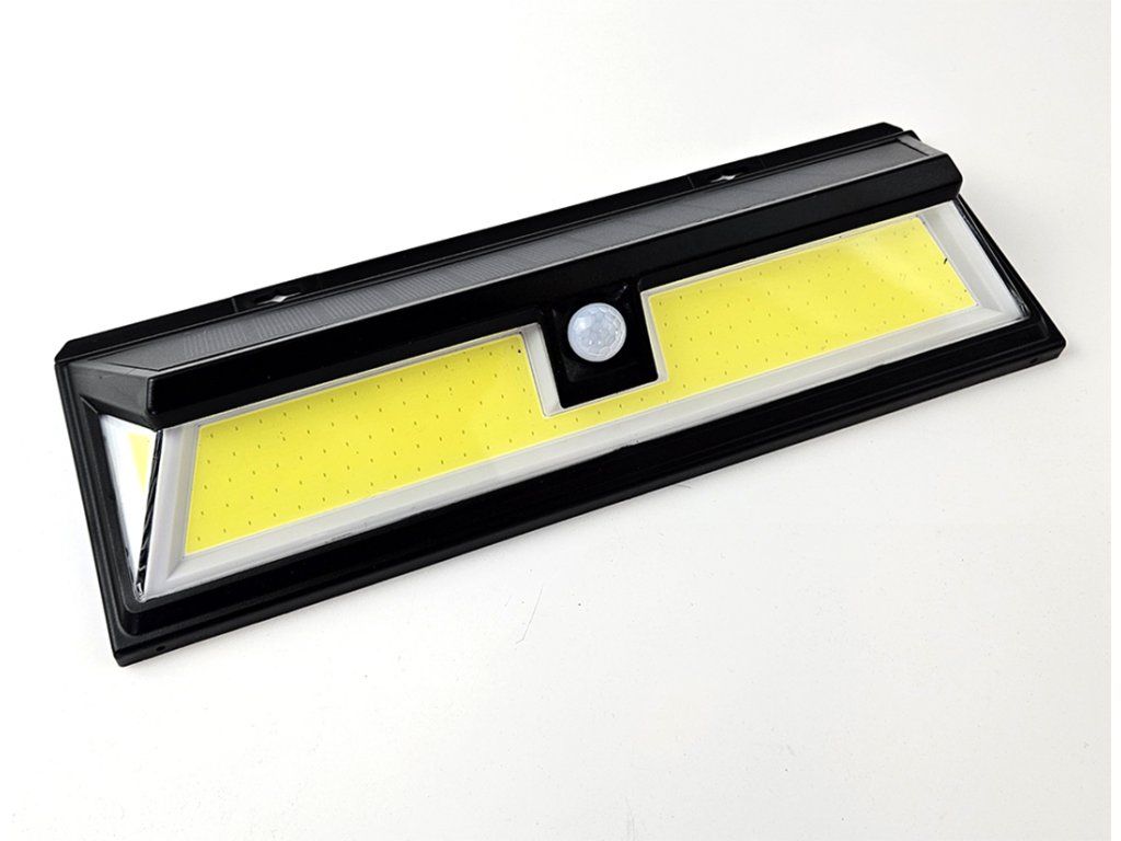 Výkonné solární bateriové svítidlo LED COB, vestavěné pohybové PIR čidlo a velký solární panel. Svítidlo je určeno pro venkovní osvětlení a pro montáž na zeď. Solární panel slouží k nabíjení vestavěné dobíjecí baterie Li-Ion sluneční energií. Díky vestavěnému snímači hladiny světla a pohybového PIR spínače se svítidlo automaticky zapne při dosažení limitu min. okolního světla (za šera) a při zaregistrování pohybu v zorném poli PIR čidla (úhel 120°/ až do 5m) a vypne při odchodu osoby (cca 15 sekund.), nebo při vybité baterii. Při rozednění (překročení limitu úrovně okolního světla) se svítidlo začne dobíjet solárním panelem. Ve dne nebude svítidlo svítit a ani reagovat na pohyb.