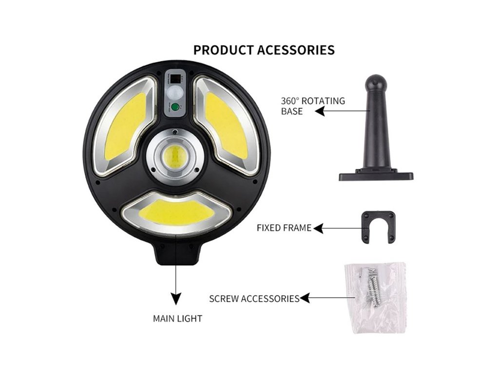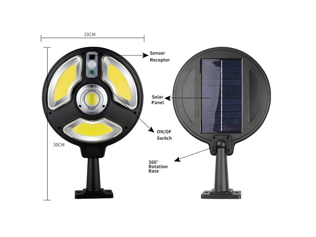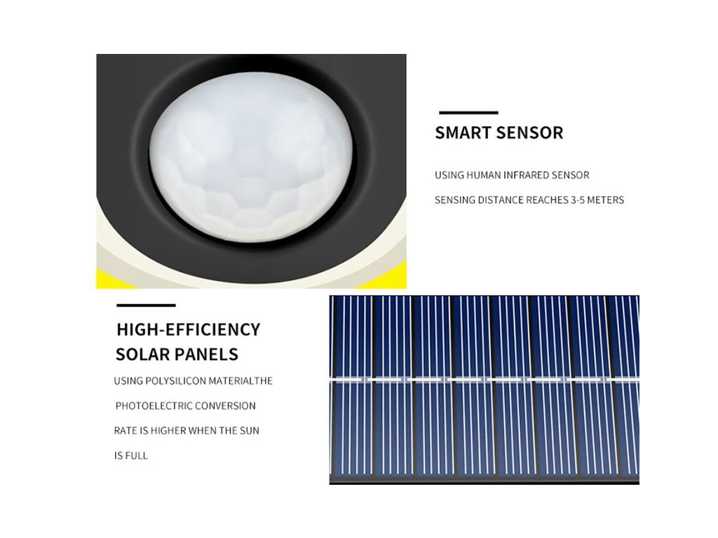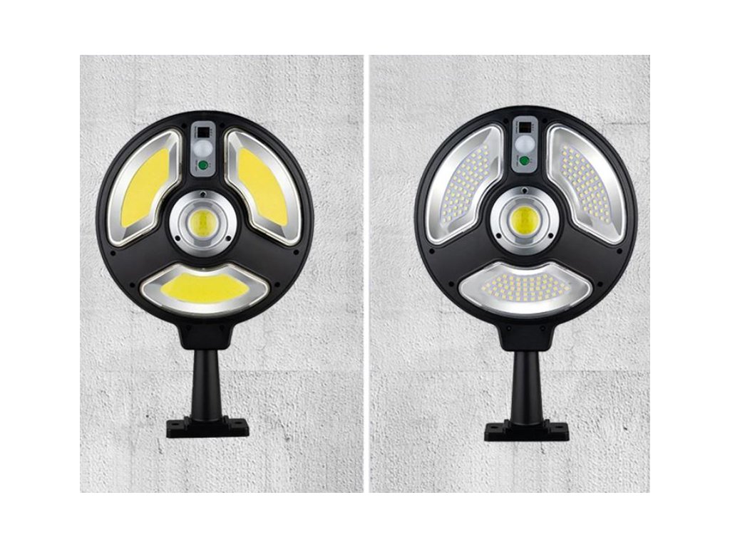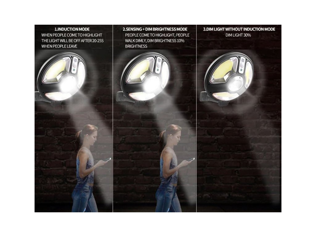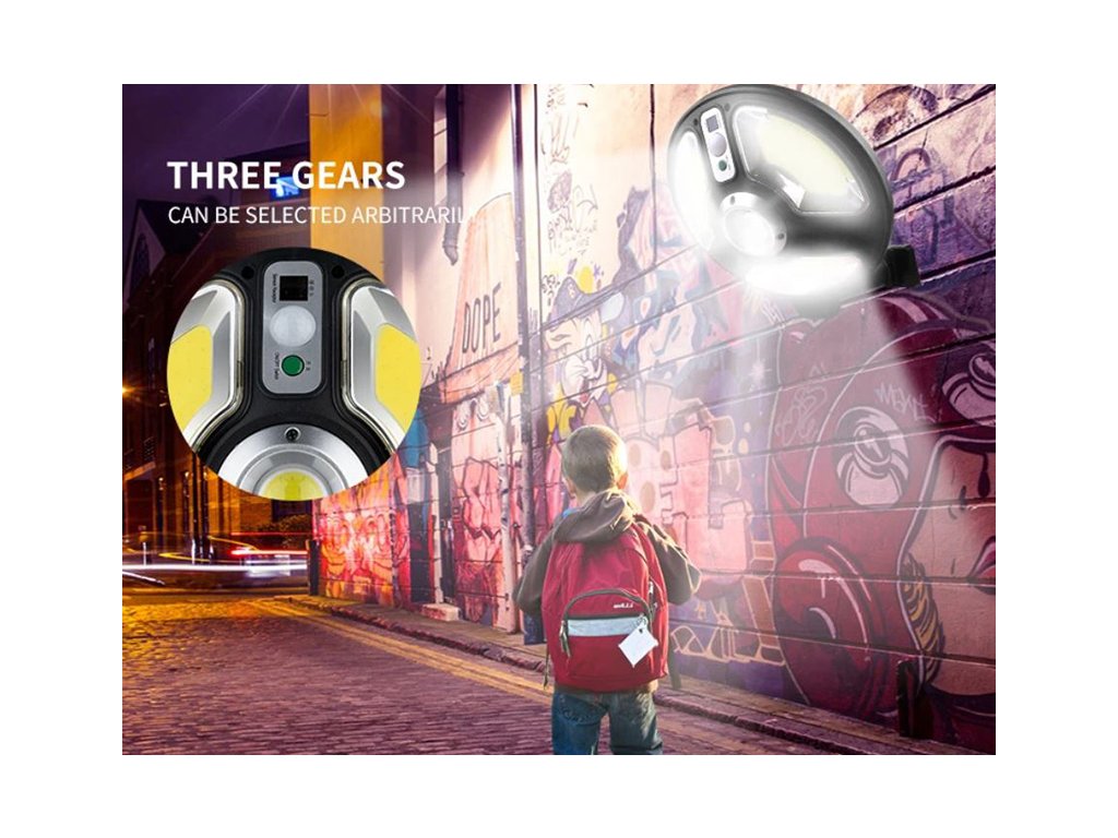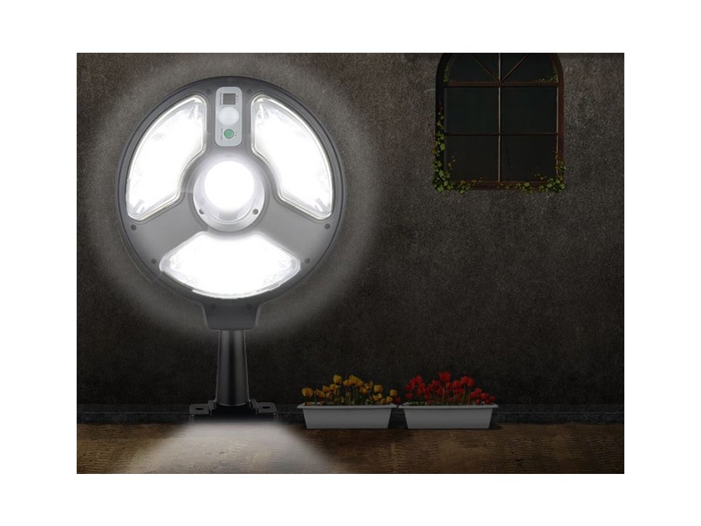 Víceúčelové pouliční LED svítidlo se solárním panelem a vestavěným pohybovým čidlem pro osvětlení venkovních prostor a to ve 3 typech svitu ve 3 různých situací.