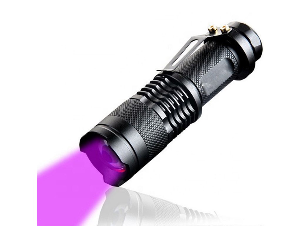 Taktická svítilna s výkonnou UV LED diodou 395 nm ve vysoce odolném pouzdře. Svítilna se pyšní velmi výkonným zdrojem světla s životností až 50 000 hodin. Zařízení využívá výkonné a energeticky úsporné baterie 17500 (x1). Svítilna je také vodotěsná a nárazuvzdorná. Spínač je chráněn odolnou gumovou vložkou a O-kroužky chrání zařízení před nečistotami a prachem. Funkce proměnné ohniskové vzdálenosti (ZOOM) umožňuje zaostřovat nebo rozptylovat UV světlo v závislosti na vašich potřebách.