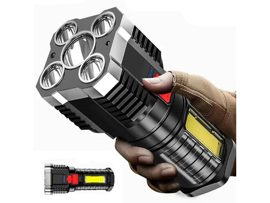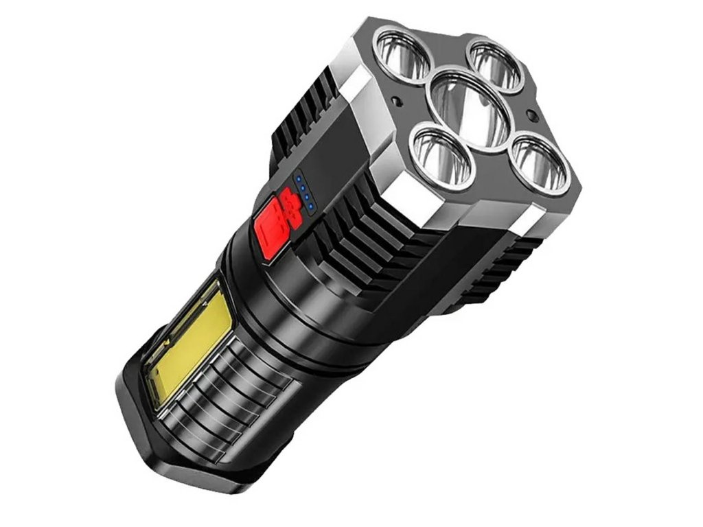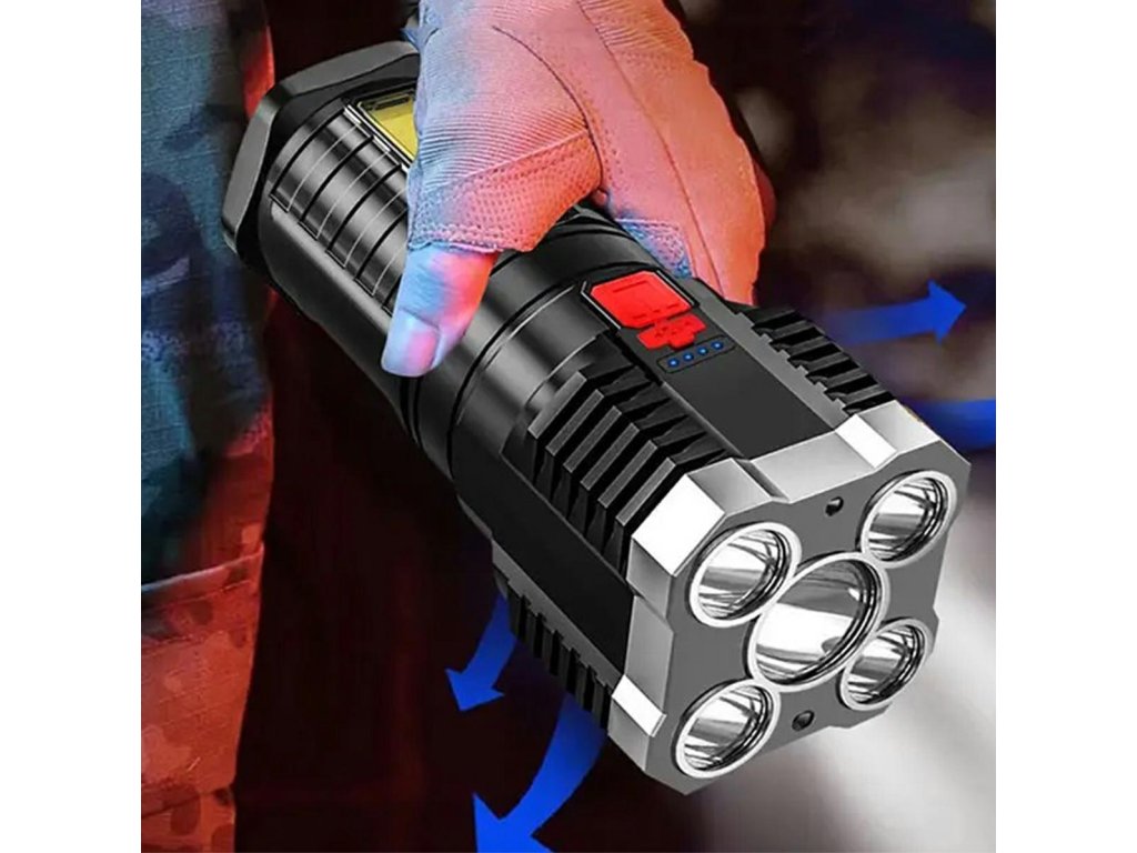 Taktická svítilna s pěti výkonnými T6 LED diodami umístěnými ve vysoce odolném pouzdře. Svítilna se pyšní velmi výkonným zdrojem světla s dlouhou životností. Robustní, reliéfní pouzdro zajišťuje bezpečný úchop a pohodlné ovládání. Svítilna je také vodotěsná a nárazuvzdorná. Spínač a USB port jsou chráněny odolnou gumou a O-kroužky chrání zařízení před nečistotami a prachem. Další LED diody jsou umístěny na boku. Vestavěná baterie se nabíjí pomocí dodaného USB kabelu a stav nabití je viditelný pomocí LED indikátoru.