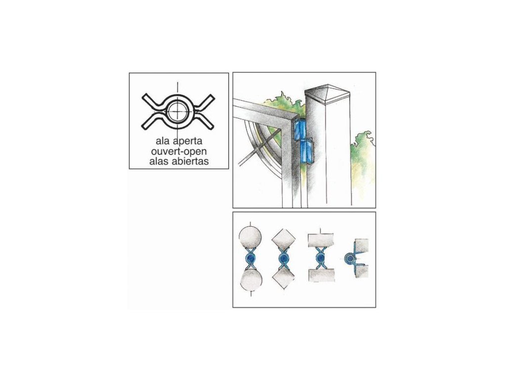 Boční pravý i levý pant dlouhý se středovým kroužkem vhodný pro montáž na kovové sloupky, jekly, trubky, desky a jiné profily.