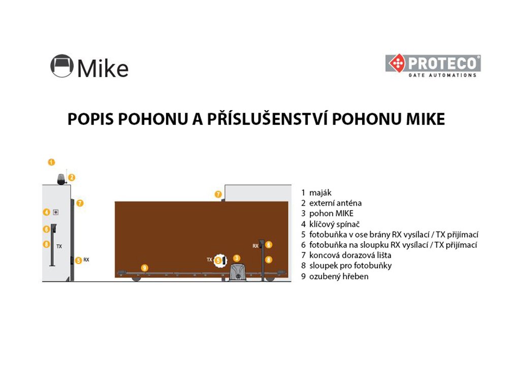 Sada je sestavena z nové řady špičkového pohonu MIKE, který doplňuje pohony PROTECO-MyStrike, jež se velmi dobře osvědčili a to i v extrémních podmínkách. Tato sada je sestavena pro namontování na posuvnou bránu tak, aby montáž funkční a co nejjednodušší. Doporučujeme pro tuto sadu dokoupit ozubené hřebeny (viz naše nabídka) do délky průjezdové šíře brány. Sadu lze dále rozšiřovat dokoupením majáku, libovolného počtu dálkových ovladačů Proteco (dle naší nabídky), vstupní kódovou klávesnicí, čtečkou karet, klíčového spínače a dalších ovládacích i bezpečnostních prvků.