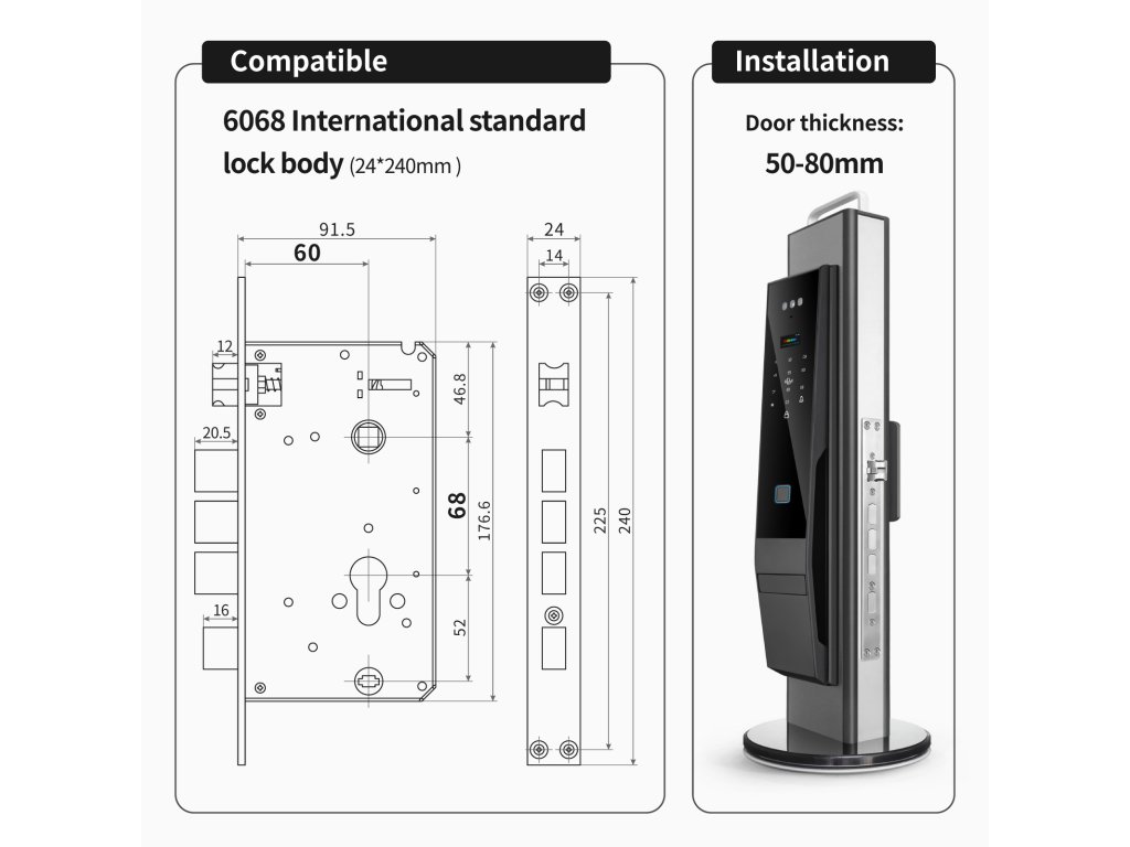 Kompatibilita dveří • Tloušťka dveří: 50–80 mm • Vhodné pro: dřevěné, ocelové, nerezové, hliníkové a mosazné dveře