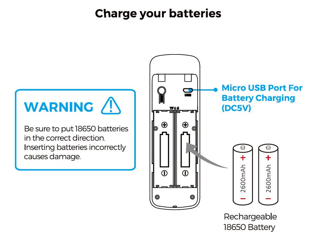 Napájení: nabíjecí baterie 18650 s dlouhou životností, které je možné dokoupit. Pozor na rozměry baterie, dokupujte pouze doporučenou (kód zboží 7005168) s rozměrem 65mm. Výdrž na jedno nabití 2 - 3 měsíce dle kvality baterií a četnosti detekcí.