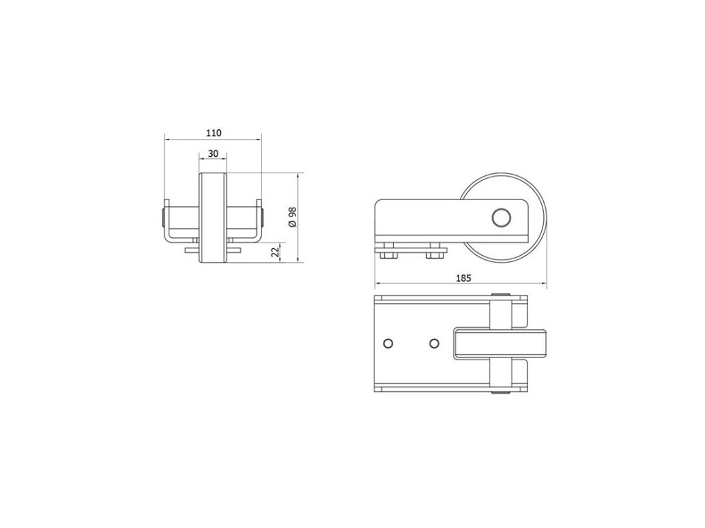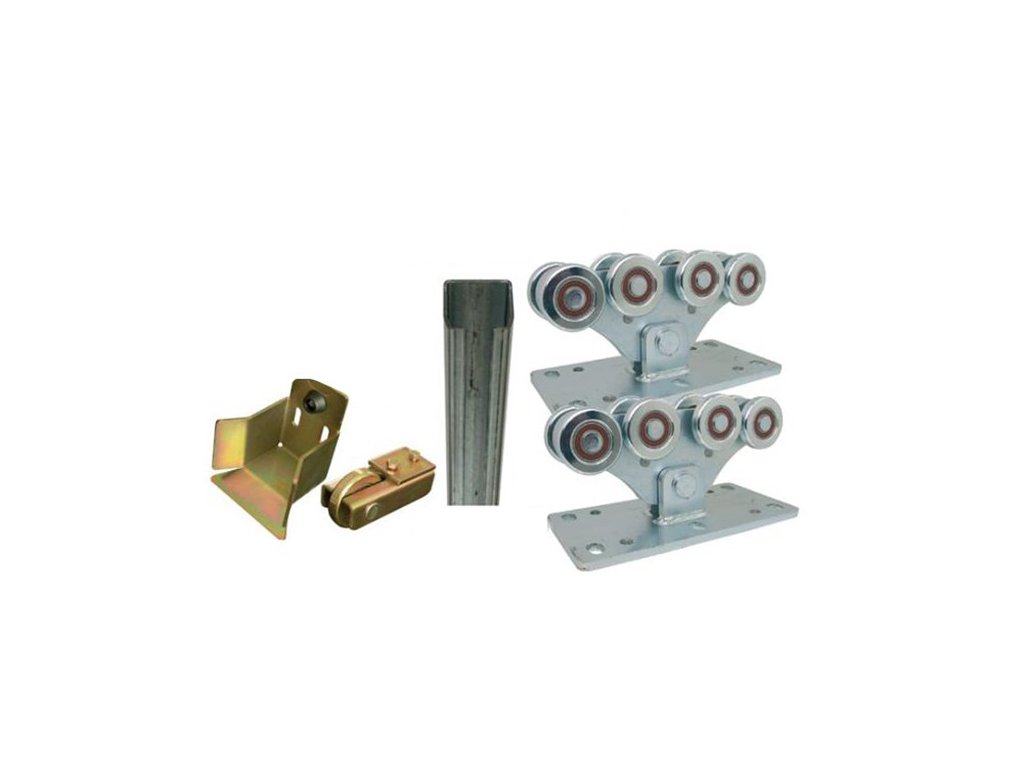 Vozíky jsou našroubovány na betonovou základovou desku a to při 10m průjezdu jsou min. 3,5m od sebe. Ukotvení vozíků proveďte například kotevní pastou nebo jinou chemií. Vzdálenost vozíků od sebe je min. jedna třetina průjezdové šíře brány. Kapsa se instaluje na protilehlou stranu vjezdu tak, aby C profil navařený na spodním rámu brány zajížděl pomocí koncovky s kolečkem do této kapsy a v zavřené poloze byla brána stabilizována a zajištěna. Horní držák nebo olivy zajišťují bránu proti pádu a zlepšuje její posuv (nejsou součástí sady).