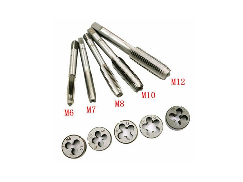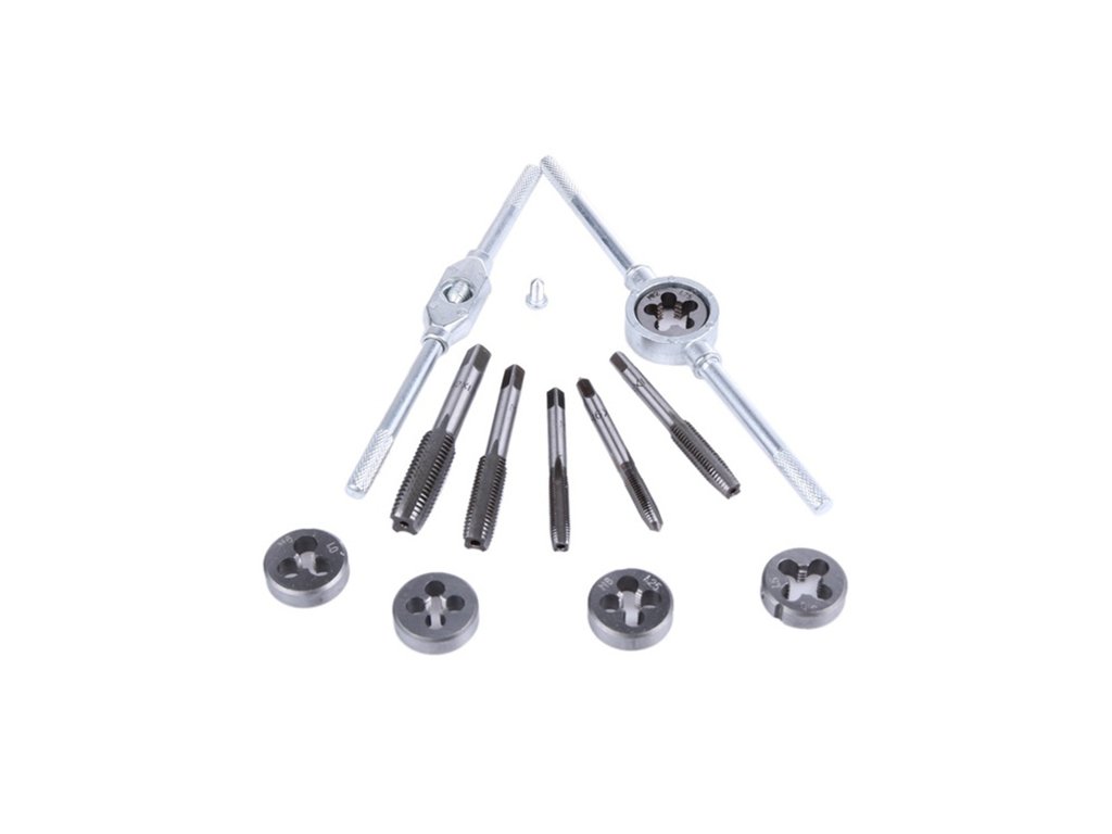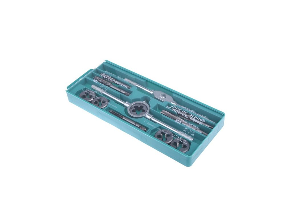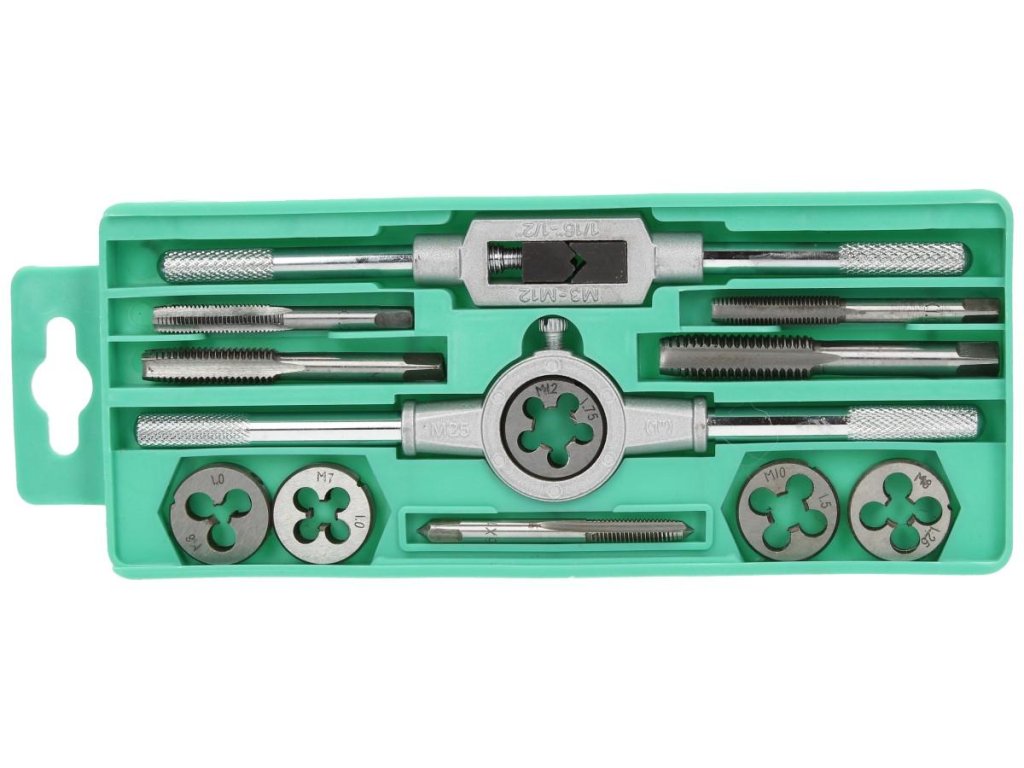 Praktická sada závitníků a oček pro vytvoření metrického závitu nebo šroubení do železných a jiných materiálů.