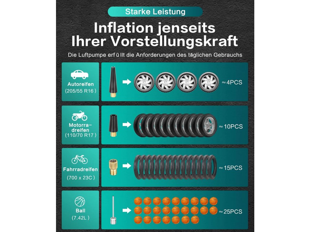 Více funkcí a rychlé nafouknutí: Naše elektrická vzduchová pumpa má super nafukovací schopnost a dokáže dosáhnout rychlého nafouknutí za 20 sekund. Je vybaven 4 přídavnými konverzními hlavami, ideální pro auta, kola, motocykly, míče a další nafukovací čluny.