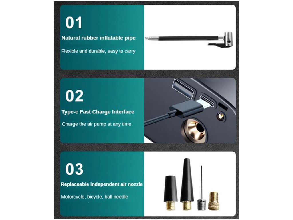 Kovové pouzdro a kovové připojení: bateriové vzduchové čerpadlo je vybaveno matným kovovým pouzdrem, které je více texturované, poskytuje lepší odvod tepla a zároveň snižuje hluk. Použití nerezového ventilu dokáže zajistit přetlak při nafukování a je velmi odolné.