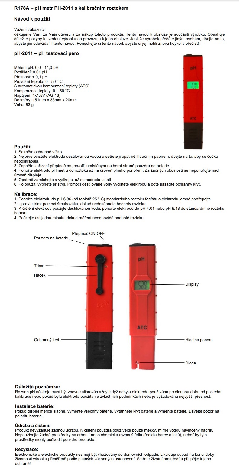 Obsah balení: 1× pH metr 1× šroubovák 2× kalibrační tlumivý roztok (4,0 a 6,86) – Pufr