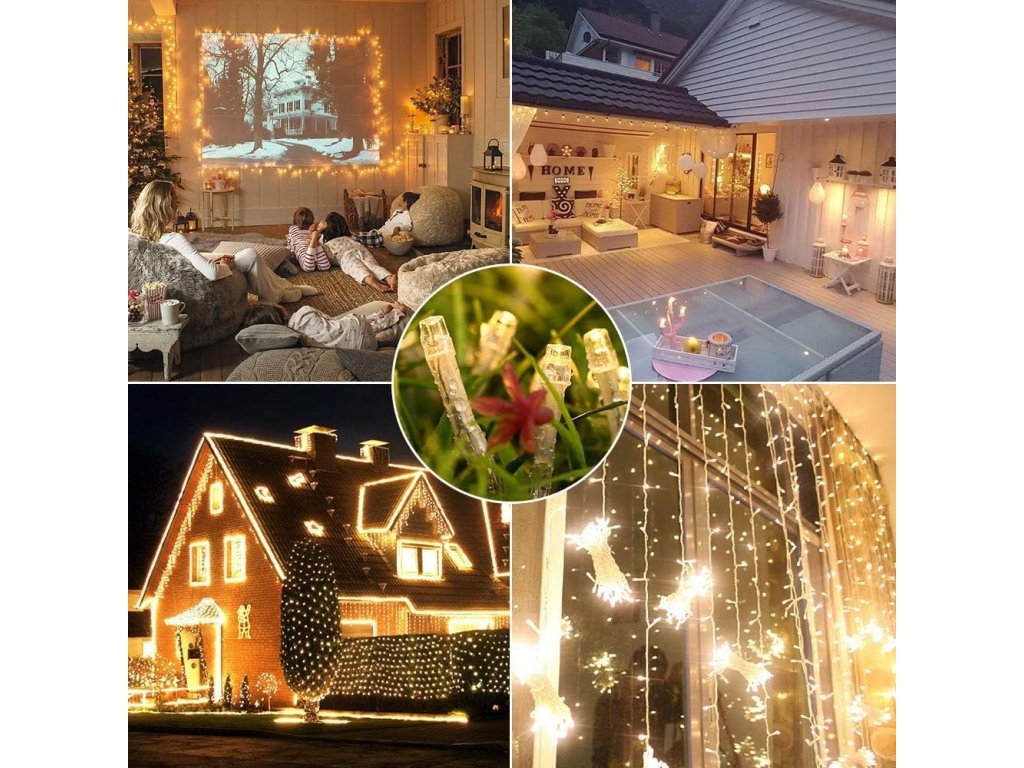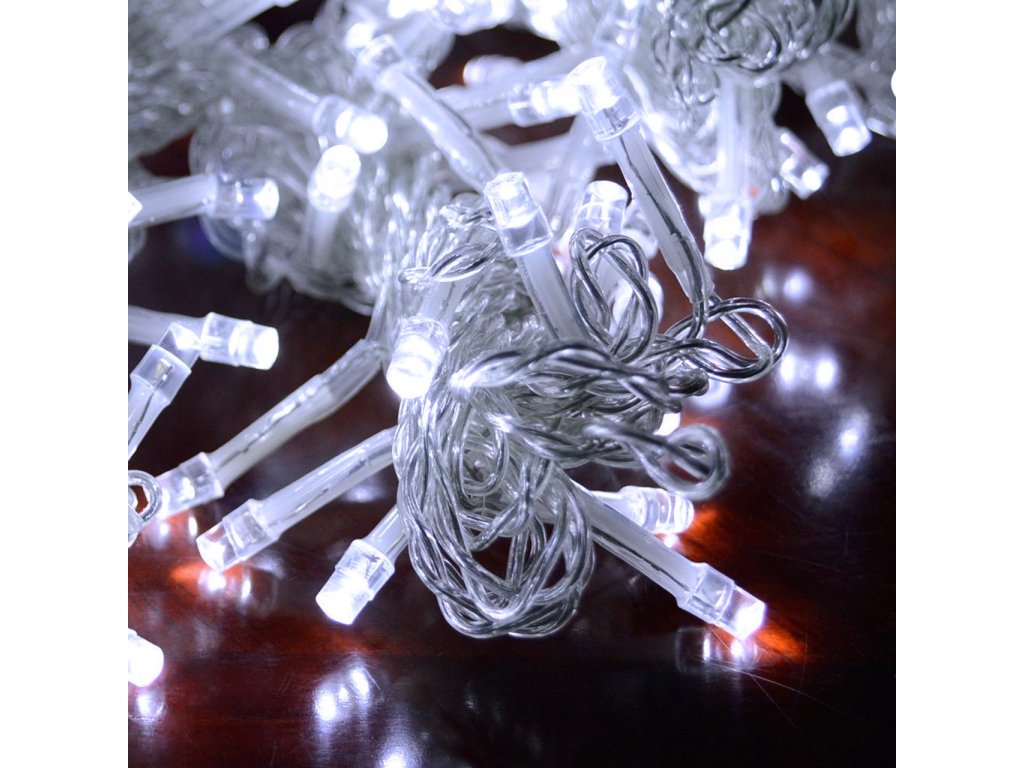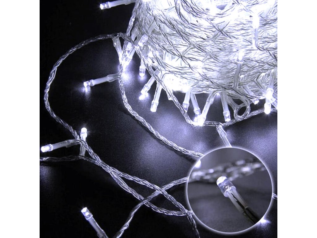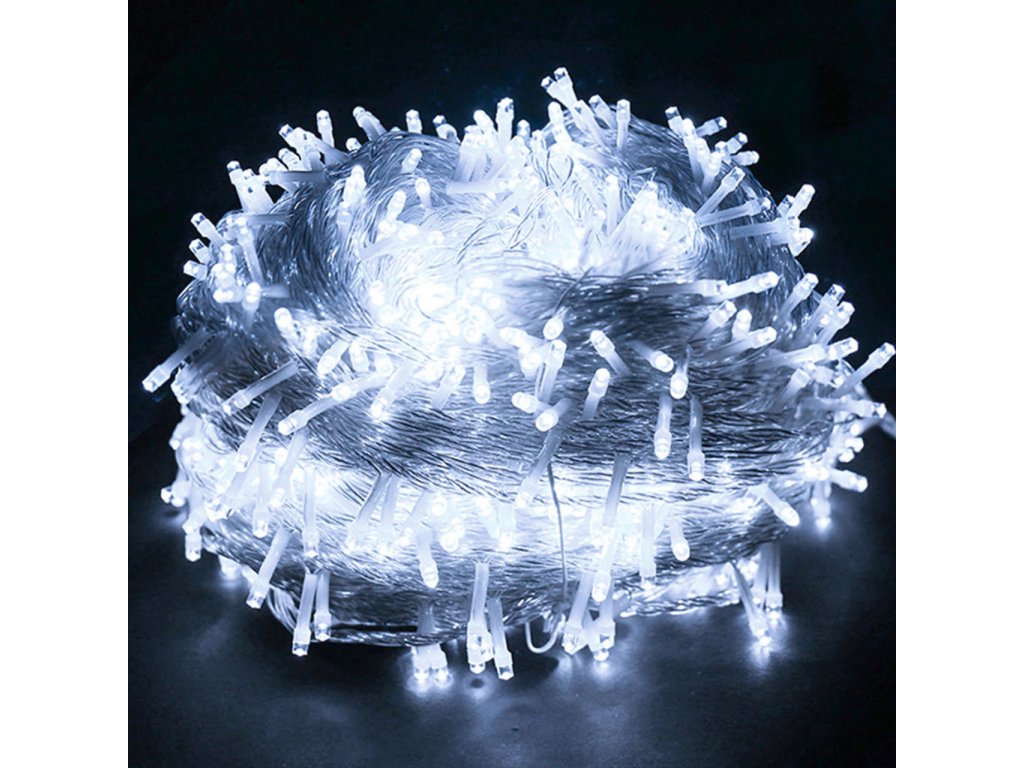 Dekorační led osvětlení 100 m se svitem studené bílé, bílé teplé a modré barvy, 1000x LED. Světelný 100m řetěz je vhodný pro vnitřní i venkovní použití - jak na zahradu, dům, na plot, na strom, terasu, okno či chodbu. Osvětlení není výhradně určeno pro dobu Vánoc, ale můžete ho využít i pro dekorativní účely při zvláštních příležitostech (svatby, narozeniny, party). LED diody jsou oblíbenou náhradou za klasické žárovky. Oproti klasickým žárovkám LED diody nevyzařují teplo, jsou odolné proti otřesům a můžete díky nim ušetřit téměř až 90% energie, které byste jinak spotřebovali u klasických žárovek. Průměrná životnost LED diody je 20.000 hodin svícení (normální žárovka cca 1000-2000 hodin v závislosti na svítivosti). Světelné funkce lze nastavit přímo na adaptéru. Každý řetěz obsahuje spínač přímo na adaptéru, pomocí kterého měníte mezi osmi způsoby svícení (blikání, pozvolné rozsvícení a další).