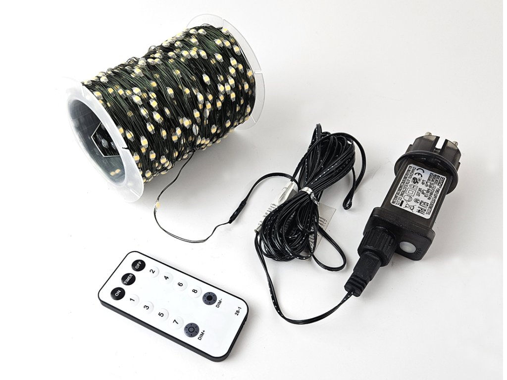 Vánoční led osvětlení - drátový řetěz o délce 100m se svitem bílé studené nebo bílé teplé barvy, 1000x LED, voděodolný napájecí adaptér do zásuvky 230V. Dálkové ovládání pro zapínání, vypínání, nastavení jeden z 8-mi programů svitu a nastavení času automatického zapnutí a vypnutí světelného řetězu.