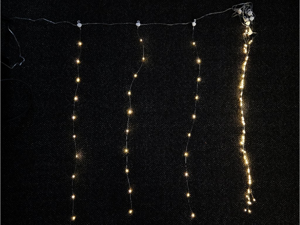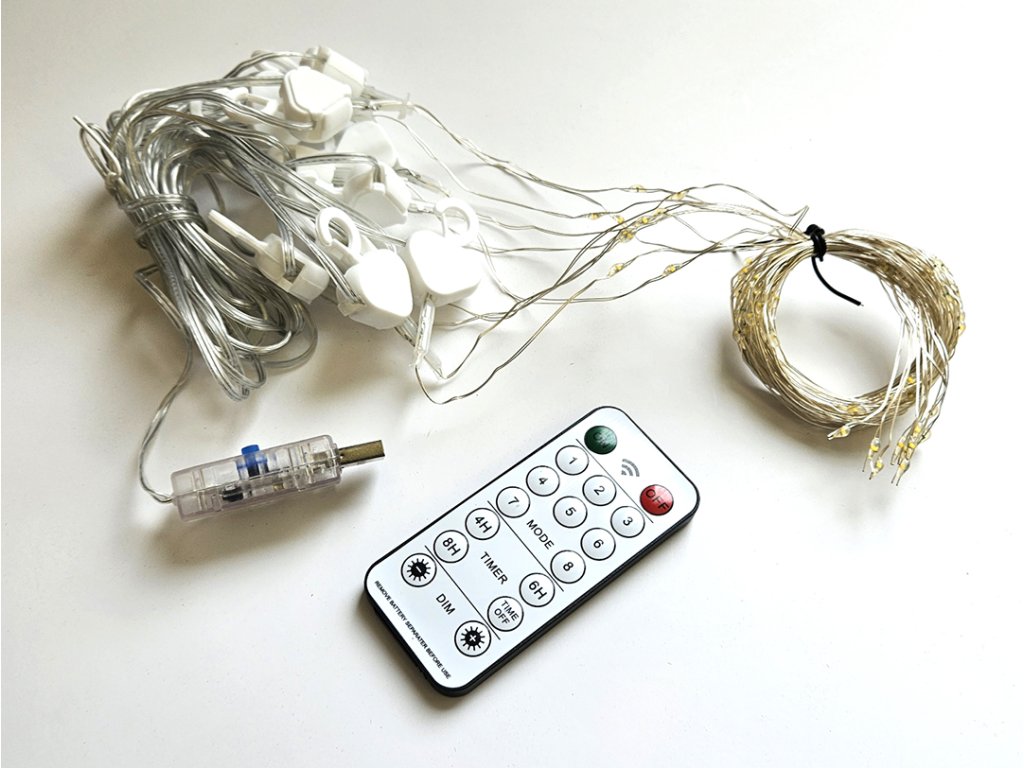 Nádherná světelná dekorace napájená z USB dlouhá 3m s 8 světelnými programy a dálkovým ovladačem pro ozdobení oken, zábradlí, schodišť, zakrytých balkónů, altánů a pod. Světelná dekorace má celkem 100 LED diod na stříbrném drátu a dekorace vypadá jako světelný déšť. Světelný dekorační závěs je vyroben z kvalitních mikro LED diod, propojovacího kabelu, stříbrného drátu na závěsných šlahounech a praktických háčků pro zavěšení šlahounů. Dekorační světelný závěs je vybaven 1,5m přívodním kabelem s vidlicí do zásuvky USB.