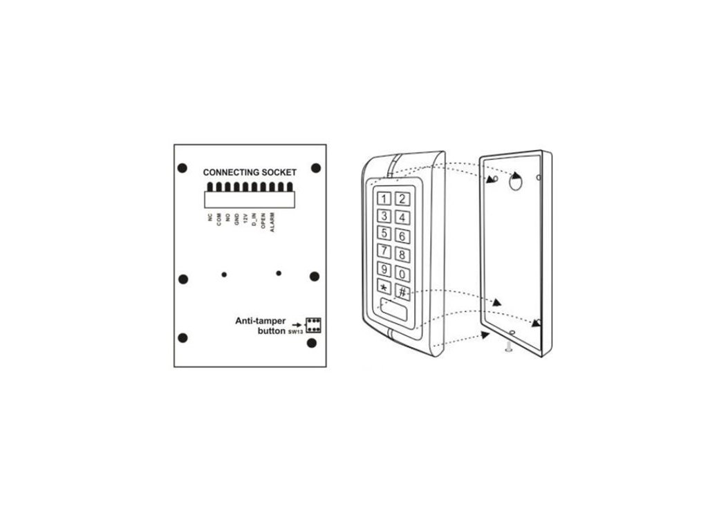 Součástí balení: Kódová klávesnice se čtečkou karet, usměrňovací křemíková dioda, hmoždinky a šrouby pro upevnění